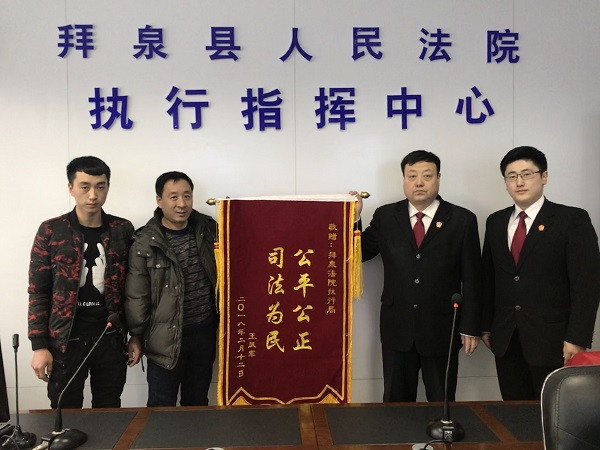 “眼看就要过年了,执行法官们也没休息,你们这么尽心为我办案,让我真正感受到了公平和正义,真的非常感谢你们”!2018年2月13日上午,申请执行人王某来到拜泉法院将一面写着“公平公正、司法为民”的锦旗送到执行法官的手中表示对该院法官司法为民的感激之情,这是拜泉法院执行局于近日开展的执行行动的一个缩影,也是拜泉法院2018年执行工作的一个良好开端。