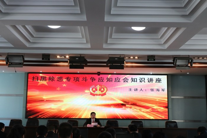讲座上,张海军从扫黑除恶专项斗争的起始时间、工作重点、重大意义、目标任务、突出打击的20类重点等方面,并结合典型案例,详细讲解了扫黑除恶业务知识。