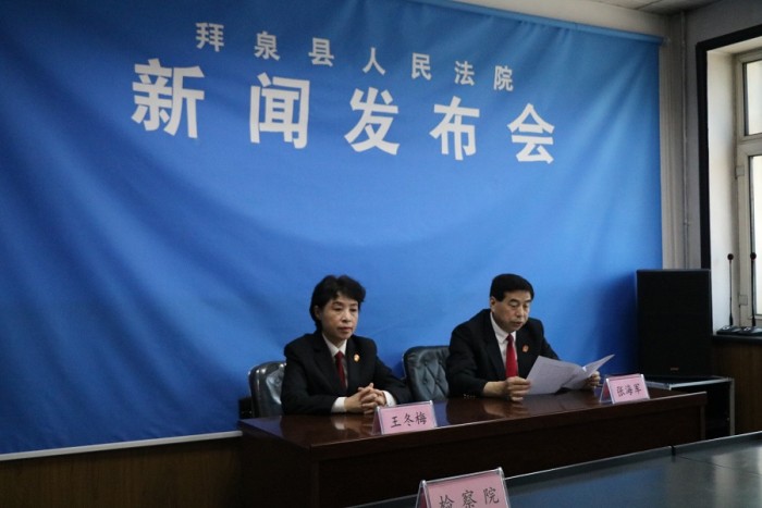 5月24日,拜泉县人民法院召开扫黑除恶专项斗争新闻发布会,院党组成员、副院长张海军向媒体通报拜泉法院扫黑除恶工作开展情况和阶段性成效。拜泉县扫黑办、公安局、检察院、司法局代表,以及拜泉县电视台记者受邀参加了发布会。发布会由院党组副书记、副院长王冬梅主持。