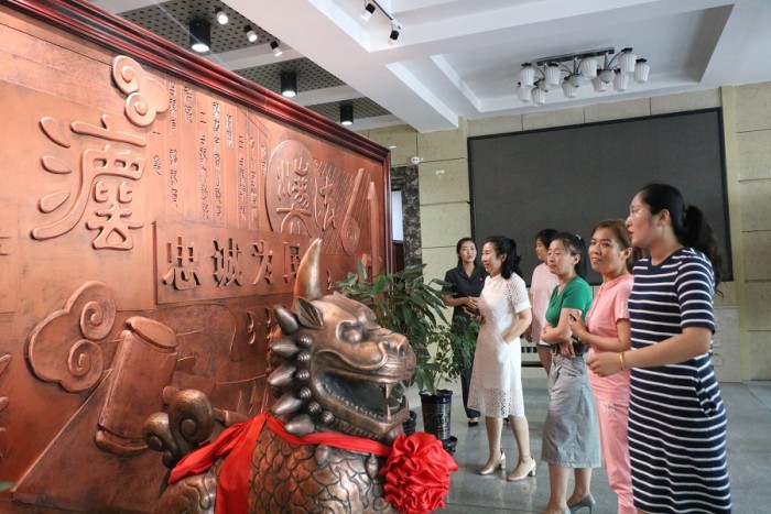 在一楼的法院文化墙前,神兽獬豸的传说和墙上的浮雕深深地吸引了她们,大家纷纷在文化墙前合影留念。