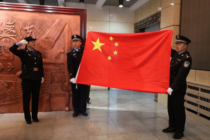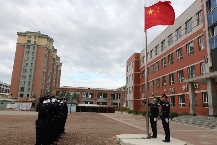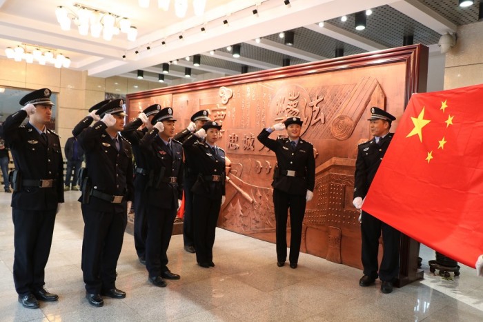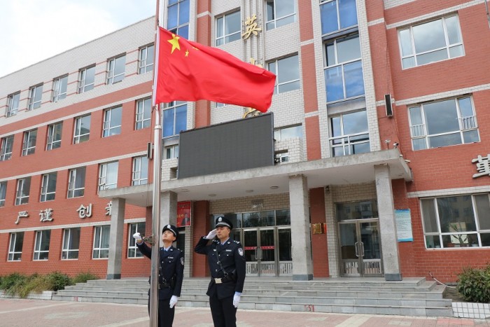 当威武雄浑、催人奋进的国歌响起,五星红旗迎风招展,全体司法警察肃穆而立,庄严的向国旗宣誓,壮怀激越、豪情坦荡,感受国旗与国歌的庄严雄壮,送上了对祖国最崇高的敬意。