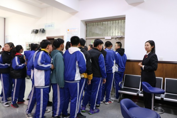 师生们首先在法院工作人员的引导和讲解下,依次参观了诉讼服务中心各项设施,随后参观了家事调解室、院史室。了解了诉讼服务中心的功能,体验了法院的安检系统,知晓了法庭审判设施的用途,明白了法徽、法槌、天平的含义。